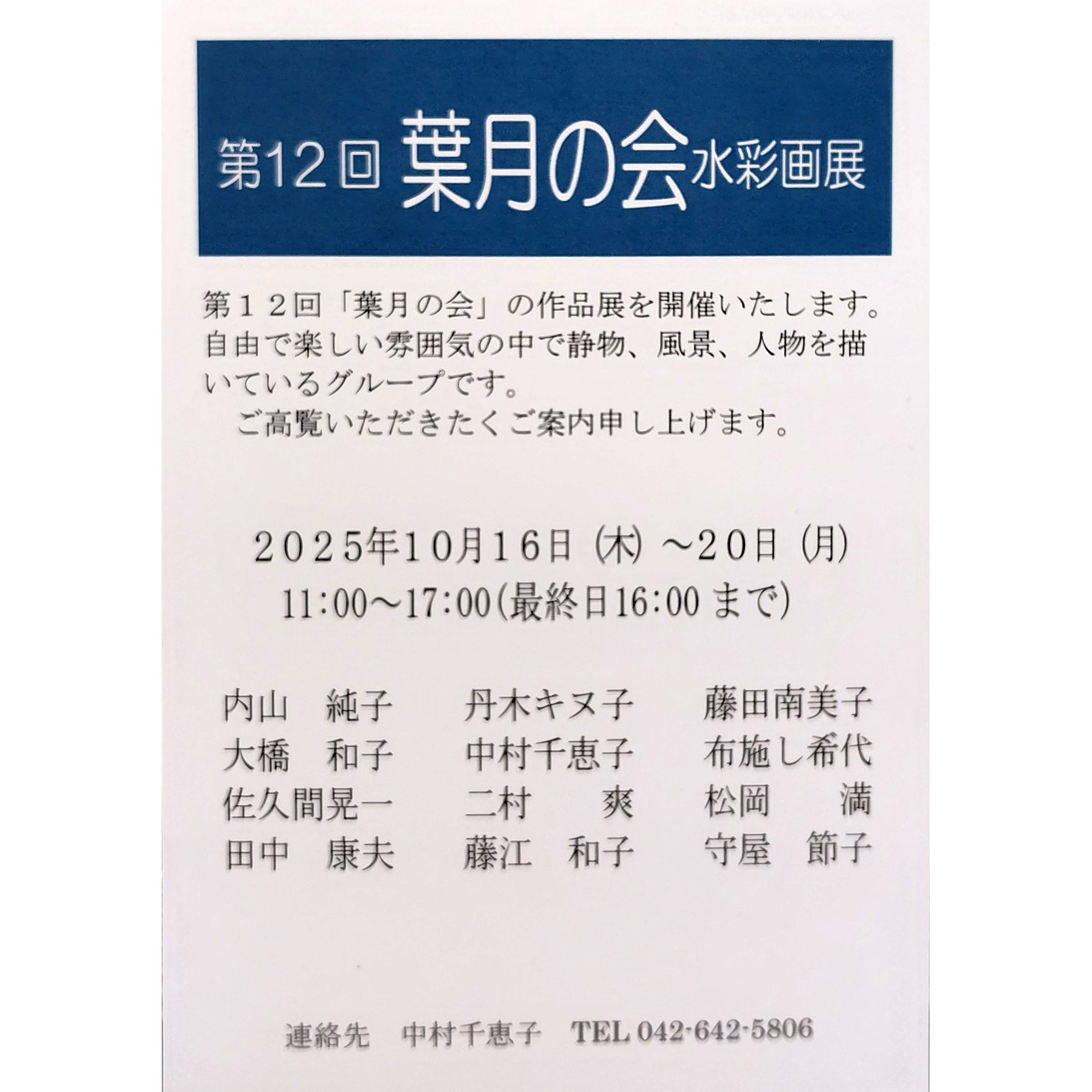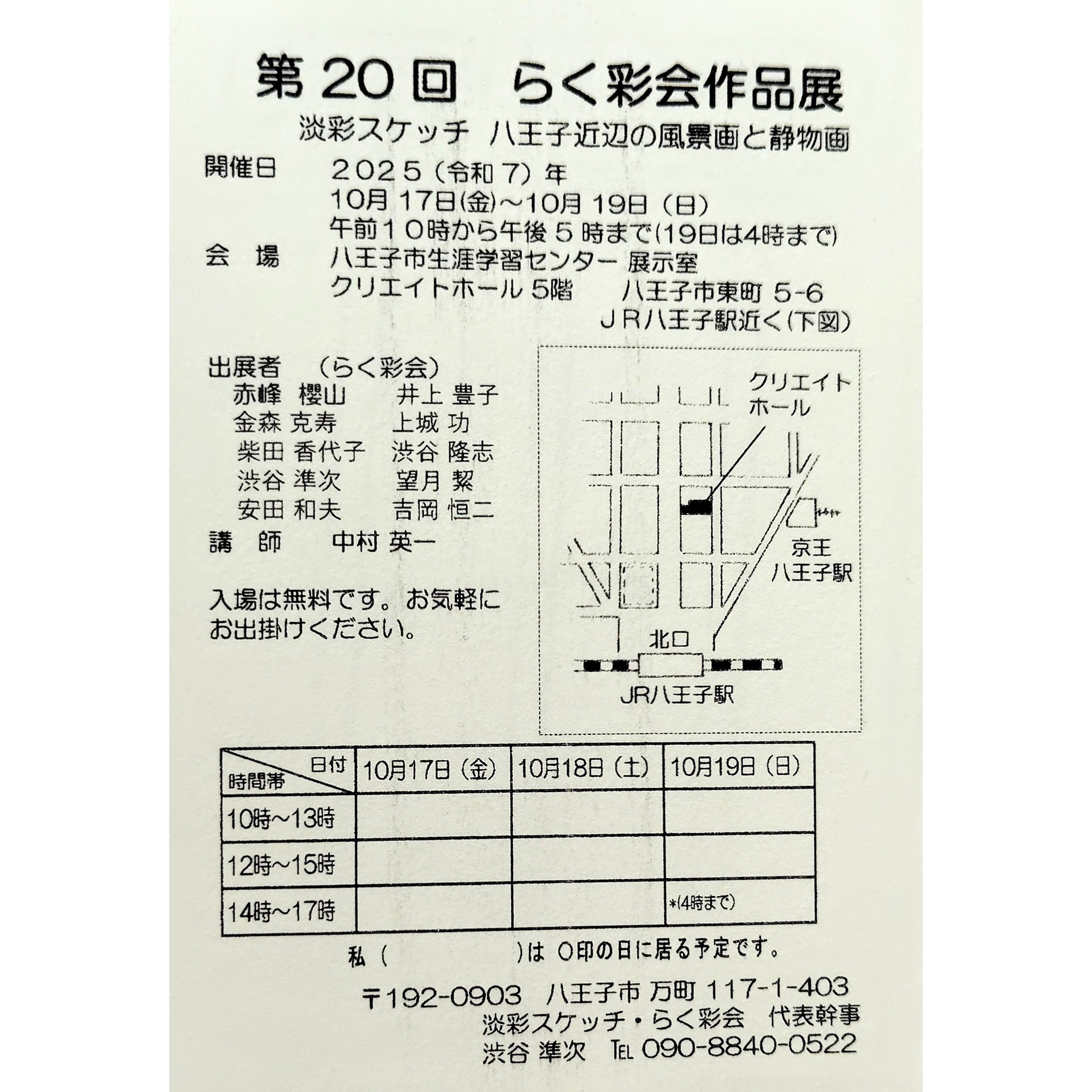 淡彩スケッチ、八王子近辺の風景画と静物画を描くグループの作品展です。