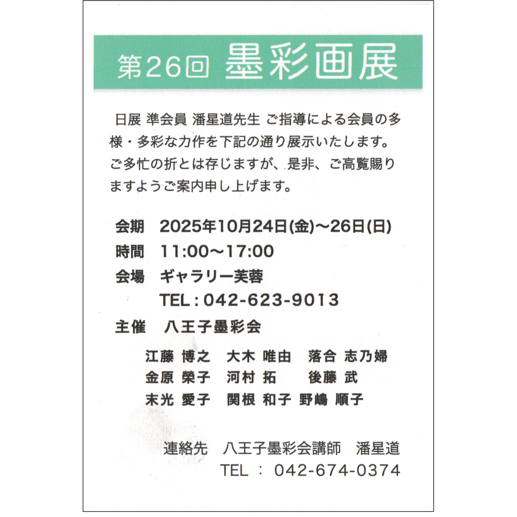 日展準会員、潘星道先生の教室の作品展です。連盟会員の大木唯由さん、落合志乃婦さん、河村拓さんが出品します。