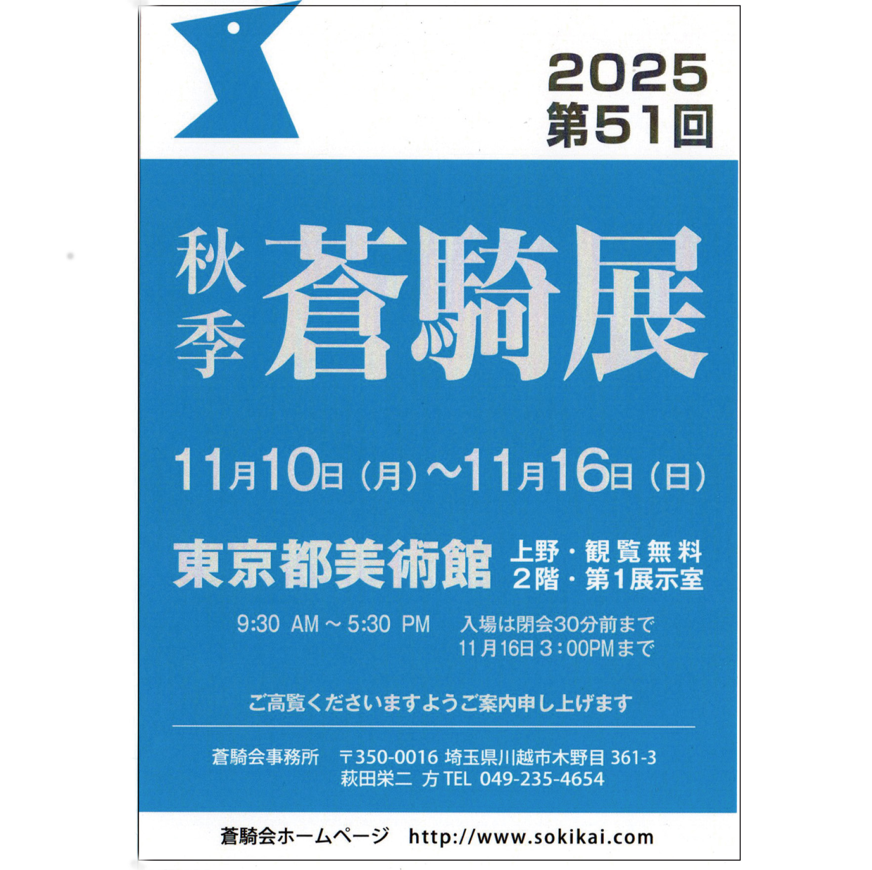 秋の蒼騎会展である秋季蒼騎展が開催されます。連盟会員の岩間幸雄さん、榎本豊さん、美濃川瑛さんが出品します。