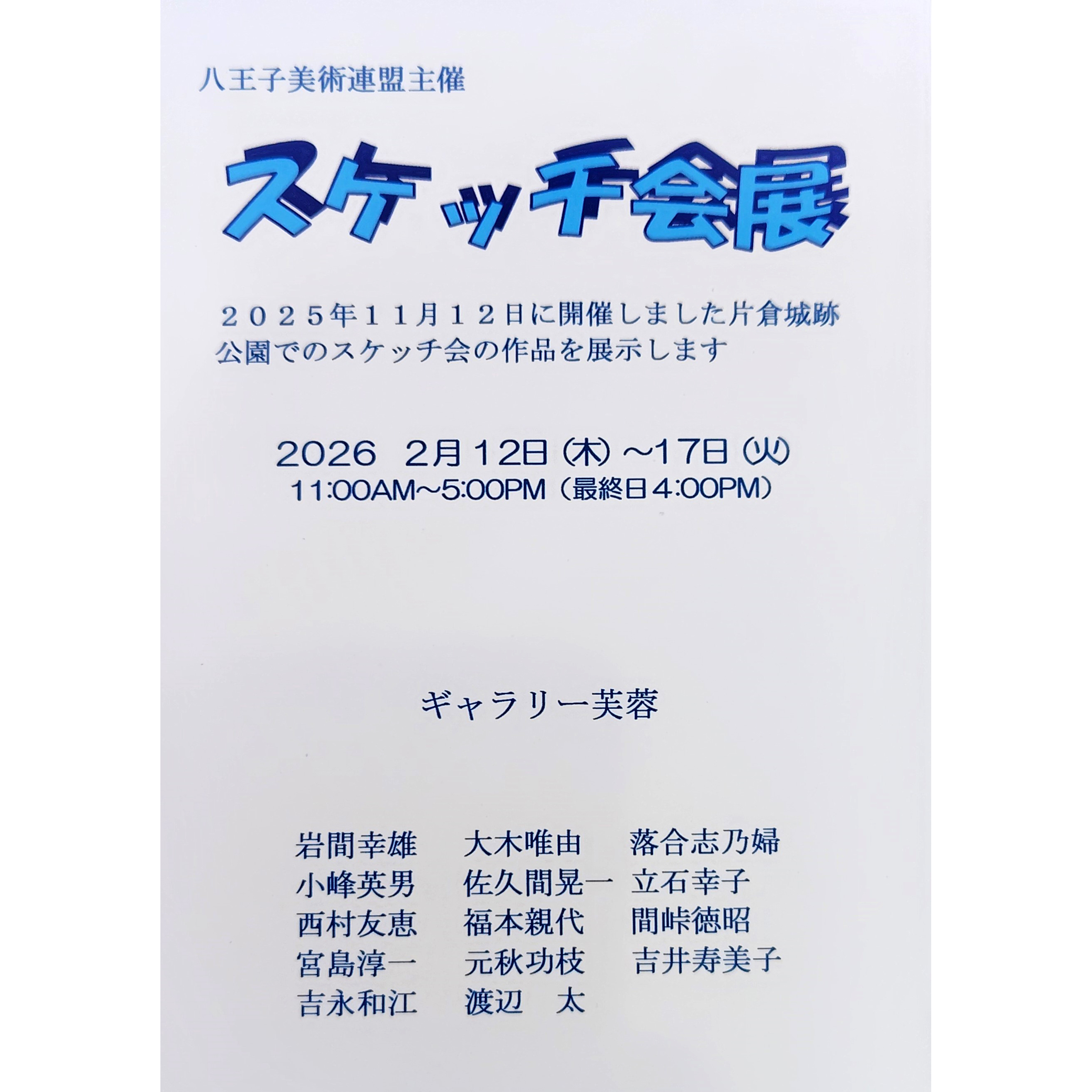 八王子美術連盟主催のスケッチ会展です。昨年11月に開催した片倉城址公園でのスケッチ会の作品を展示します。多くの連盟会員が出品します。