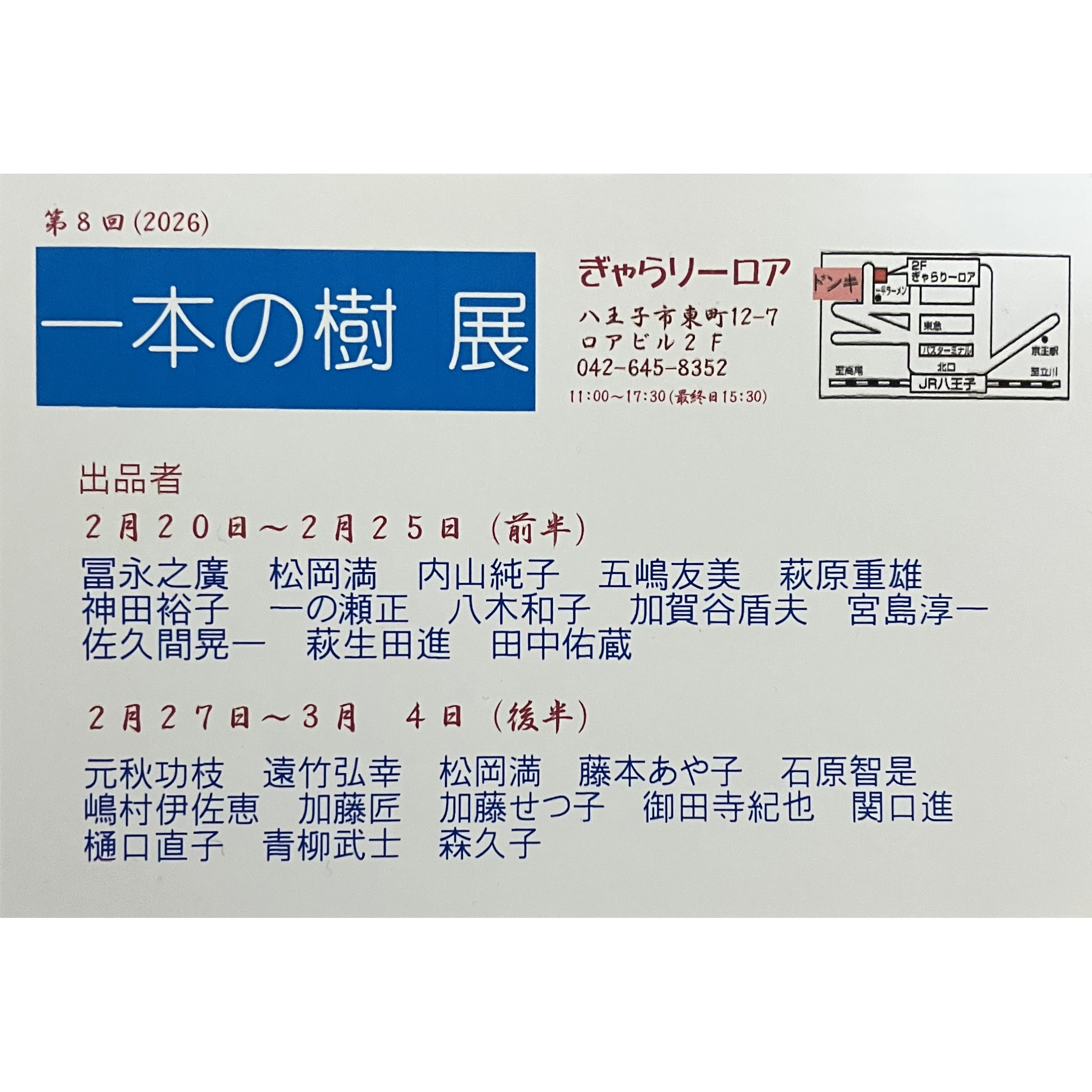 この時期ぎゃらりーロアが主催する、一本の樹がテーマの作品に限定した恒例の展覧会です。2週にわたり開催されます。
