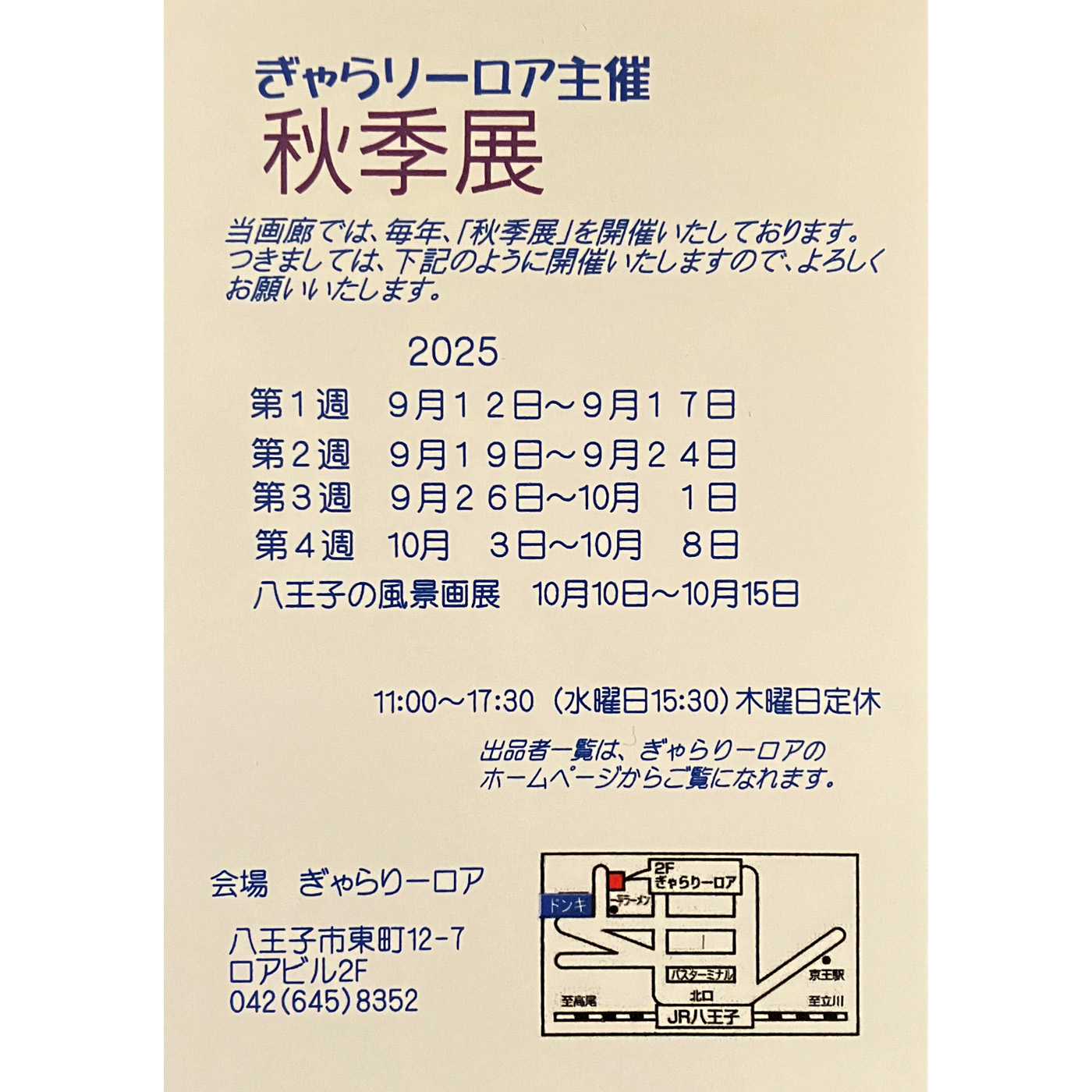 毎年この時期に開催される、ぎゃらりーロア主催の秋季展です。4週にわたり、各週12点ほどの作品が展示されます。